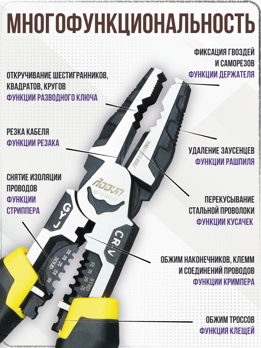 Но самое главное — это многофункциональность! Эти универсальные пассатижи умеют многое: зачистка проводов и снятие изоляции (стриппер), обжим клемм и кабельных наконечников (кримпер), откусывание стальной проволоки (бокорезы), могут использоваться как резак для различных типов проводов, держатель гвоздей, саморезов или удобные кусачки.